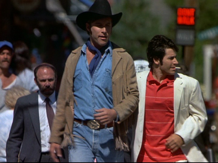 However, the borders between Hollywood and real life become permeable as we move to the next fantasy sequence, which derives from Midnight Cowboy. Joel and Chris are in the roles of the film’s characters Ratso and Joe Buck and the scene features lots of people and traffic, but we are still clearly in Cicely; Joel references both the contemporary world (saying he will take him to his friend Donald Trump) and his role as a doctor (“‘I can’t wait to get that jerk in the examining room”). In the third and final fantasy sequence, the power of Hollywood becomes even weaker, as Ed uses the generic conventions of a Hollywood Western that he populates with recent events in town; the plot involves the relationship between Shelly, Holling, and Wayne. We are seeing the earliest moments of Ed’s fledgling creativity.