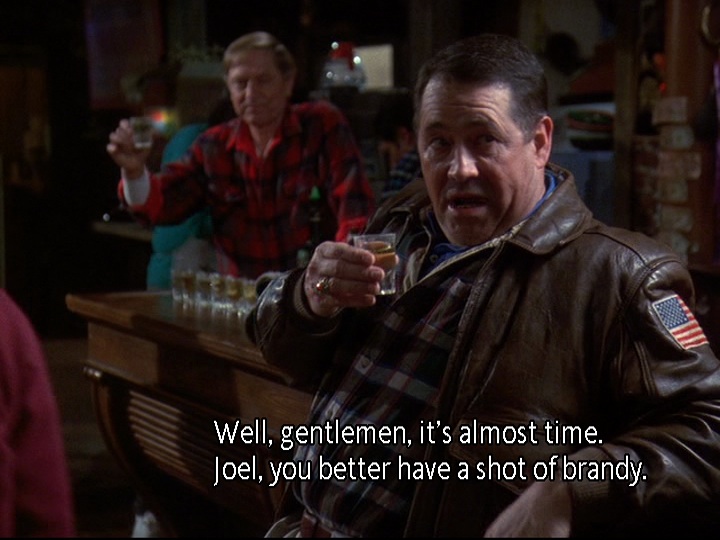 “Spring Break” begins and ends with nakedness. In Maggie’s dream, she and Joel suddenly find themselves au naturel after eating a red pippen apple near the snake. And they are surprisingly unembarrassed – even Joel. Nakedness also concludes the final scene of the episode in the final “Running of the Bulls” sequence. (Clearly, Maggie would have known that this annual event would be coming up fairly soon and that she would be seeing Joel in the buff.) The men running through the streets of Cicely are also refreshingly unashamed, even Joel, who hadn’t prepared himself for this moment, believing the run would be more like a marathon. (In a series with many shots of topless men, this episode takes the cake.) The communal spirit driving the “Running of the Bulls”, which could have been a simple display of machismo, is joyous. It somehow feels entirely natural that after the ice breaks the men of the town would run naked through the freezing streets of Cicely with the women cheering them on. (Ed’s absence from this event is both conspicuous and fitting.)