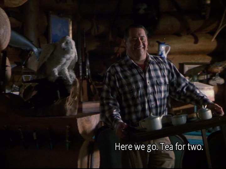 In the podcast, we read two passages that discussed the use of Lindsay Buckingham’s “D.W. Suite” to score this scene. (The first passage appears in the section “The Sounds of Cicely” in The Northern Exposure Book by Louis Chunovic, and the other passage is from the article “Moose Music” by Stephen Fried, which appeared in the Nov. 1991 issue of GQ Magazine.) As with the unashamed nudity that bookends the episode, “D.W. Suite” also appears at the start and close of the episode. First, it is played by Chris on KBHR and accompanies the shots of the landscape covered in snow and icicles melting. Then, it plays over the “Running of the Bulls” sequence, with the sounds of cheering removed: “If we go, go insane / We can all go together / In this wild, wanton world, / We can all break down forever.” In an episode full of wildness, lust, and community, this feels like the perfect song. Even the echoing of the voices on the song (“in this wild [wild wild wild wild] wanton world [world world world world]”) suits the echoing of several motifs, including nudity (start/end), lust (Joel/Maggie), fantasies (Joel/Maggie), sleuthing (Officer Semanski/Ed), radio theft (Joel/Maurice), reading aloud (Shelly: The Rainbow/Chris: Where the Wild Things Are), bingo (Beefcake Bingo/Ruth-Anne’s ‘Born To Bingo’ shirt), jungles (opening/Chris’ zoo vs. jungle analogy), bears (KBHR/Sergeant Semanski was dealing with rabid bear when she was called to Cicely), romantic rejection (Joel with Betty/Maurice with Officer Semanski), et cetera, et cetera.