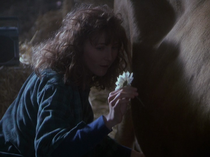 Later, when Ed meets Lightfeather in the barn, the scene opens with a 29 second shot that tracks his movement from entering the barn to his discovery of Lightfeather milking the cow. The light pouring in beside Lightfeather bathes the scene with an otherworldly glow, as it does when they’re reclining in the hay in their post-coital moment. Again, this light may also be largely generated by Ed’s perception of the moment rather than the actual reality of it. (It may even have even been suggested subconsciously somewhat based on her name, Lightfeather.)