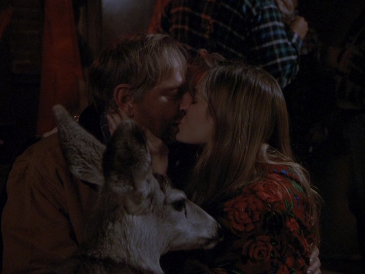 When Ed meets Lightfeather, we witness the meeting from his subjective point of view, something we seldom see on Northern Exposure. We (via Ed) see the event in slow-motion, which includes Lightfeather’s wind-swept hair and her smile, and we hear the song “Love is a Many Splendored Thing” (from the 1955 film of the same name). It is as though Ed unexpectedly finds himself starring in a romantic movie. (Based on her other scenes, we doubt that the smile we see from Lightfeather is real; more likely, it’s the smile Ed wishes she had given him.)