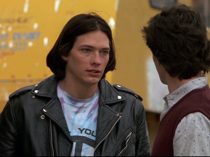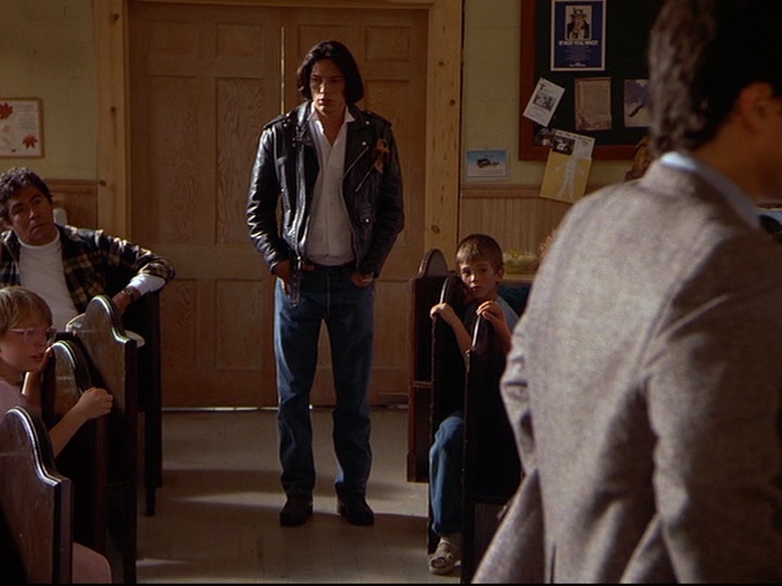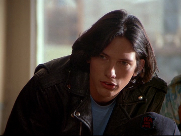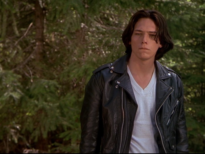 Ed’s look can be summed up with the following: leather jacket, jeans, t-shirt, and black hair. Like many of the other characters on Northern Exposure, we see him wearing the same thing over and over. For Ed, this is particularly true, with his t-shirt often being the only change in costume. Sometimes his jeans are ripped, sometimes not.