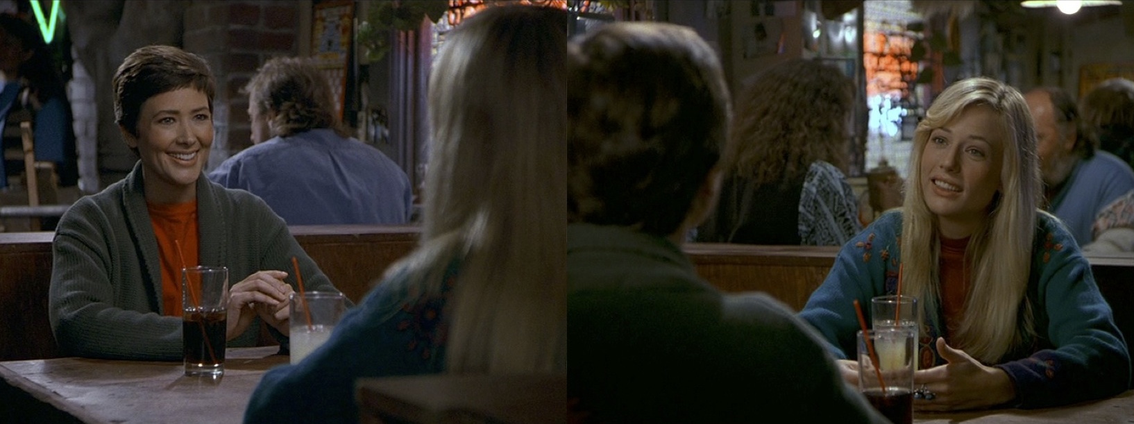 With the ghost of Rick between them, Maggie and Joanne seem complete opposite: blond and brunette, soft and hard, open and defensive, Opium and Caleche. However, visually they are linked: both are wearing red shirts and green cardigans (Joanne’s is greenish blue, at least).