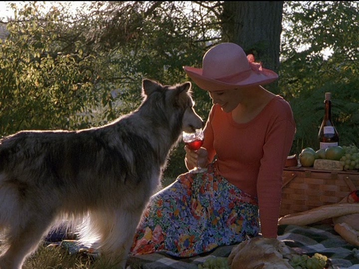 The montage with Rick the Dog that appears in the filmed episode while “Natural Woman” plays is written very differently in the script, which calls for “Lush, romantic classical music” (p. 45) to play during the scene. The script features a “turkey carcass” at the picnic and includes a few shots of Maggie peeling a “strip of meat off the turkey” while the dog “licks his chops” (p. 45). She then “tosses him the meat” and the dog “snaps it up mid-air” (p. 45), which causes Maggie to “laugh delightedly” (p. 46). After she gives him another piece of turkey, she lets the dog “lick her fingers” (p. 46). Eventually, they “run in SLO MO — ‘ELVIRA MADIGAN’ music playing” (p. .46). This is the only specific music listed in the script and it doesn’t appear in the episode. Neither does the slow motion shot.