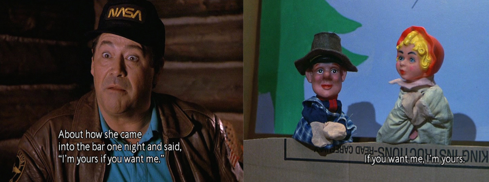 In the puppet show, Shelly portrays herself (aka “the beautiful chick maiden”) saying to Holling, “If you want me, I’m yours.” Interestingly, we think the closest echo of this exact sentence is actually spoken by Maurice in 3.2, when he says to Joel, “I guess he [Holling] told you that story about Shelly too, about how she came into the bar one night and said, ‘I’m yours if you want me.'”