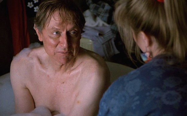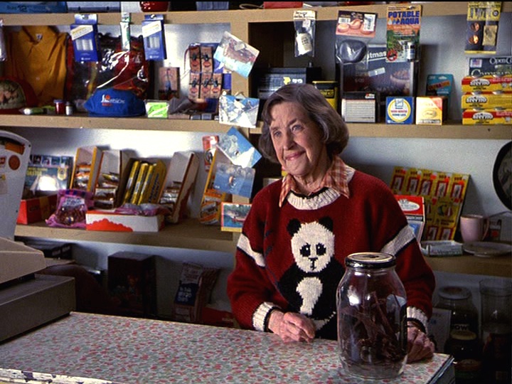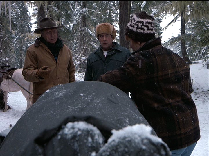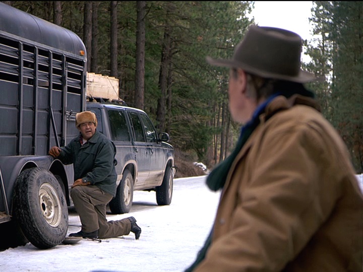 This episode is very much about friendship, especially the friendship between Holling and Maurice. It’s even structured differently than any preceding episode: we only have one main storyline, with no subplot; plus, neither Joel nor Maggie appear in the episode. There are several scenes that consist of conversations between Holling and Maurice, often taking place with them sitting side-by-side. The first scene that shows the two of them alone together and talking is one of the most interesting ones, largely because of how it is shot. This is the scene that occurs when they have to change a tire. It’s filmed as a long take with no cuts that lasts about two and a half minutes. Initially, Holling goes to change the tire, but his back goes out and Maurice takes over. They talk to each other across a distance — Holling in focus in the foreground, and Maurice out of focus in the background. When Holling asks Maurice where he wants to be buried, Maurice suddenly comes into focus and Holling becomes blurry. Here, Holling and Maurice are having a meaningful conversation, each taking his turn communicating. When Maurice comes to sit beside Holling, they are both in focus, but they’ve stopped talking to each other. Instead, they are each wrapped up in their ideas. They stop talking when the other person is speaking, but their reply is not a direct reply to the other person. It’s a technique we’ve seen on Northern Exposure before and it’s used well here.