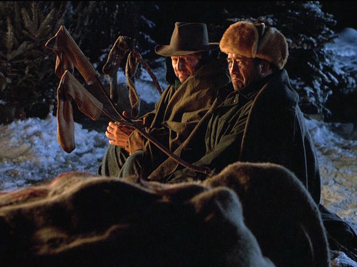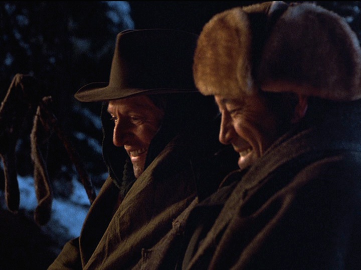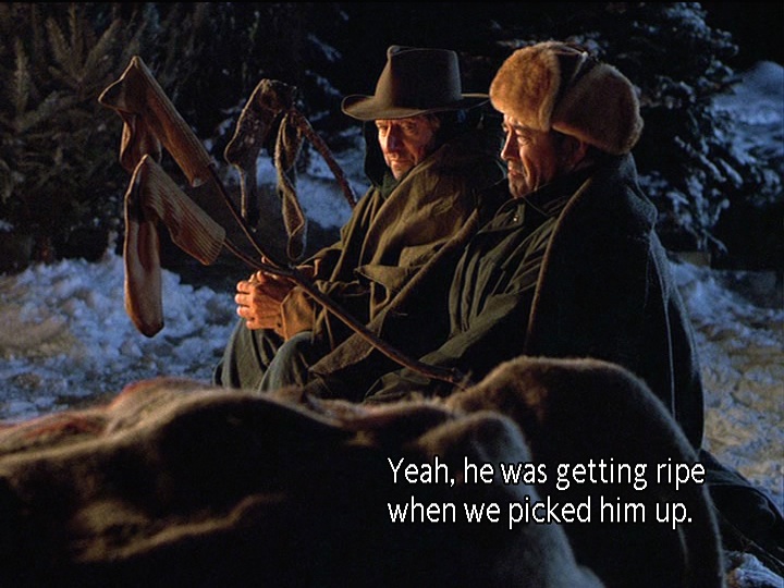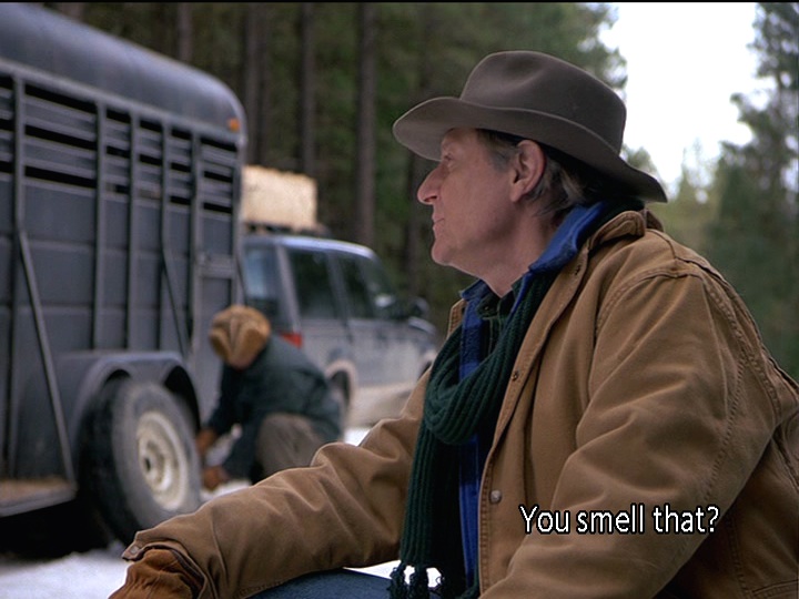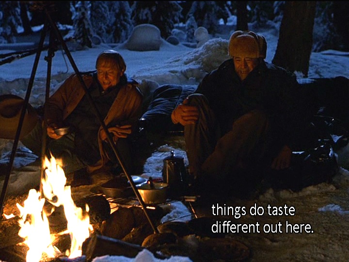 This brief moment of disconnect heightens the later moments of connection we will see, particularly the ones around the campfire, where we see remnants of the adventures that Holling and Maurice used to have together, when they were younger men and could endure more wear and tear. We also get the sense that as much as they are enjoying their time in the woods, they are also reliving moments from a shared past. This is also noticeable during the wonderful closing montage that features the song “Hands on the Wheel” sung by Willie Nelson. Midway through the song we realize that this is a love song to friendship. (We’d argue that this moment occurs when Willie sings, “And with no place to hide / I looked in your eyes / And I found myself in you.” These lines are heard during footage of Holling and Maurice making eye contact and smiling.) We are seeing Holling sift through his memories of the trek to bury Bill, now a jumble of brief, crystalline moments. One of the nice touches here is that we see the moments appear associatively rather than chronologically. One moment suggests another moment that segues into yet another brief scene, until we’re left with the two aging men riding their horses towards the horizon. We’d be lying if we said this montage didn’t trigger strong emotions in us.
