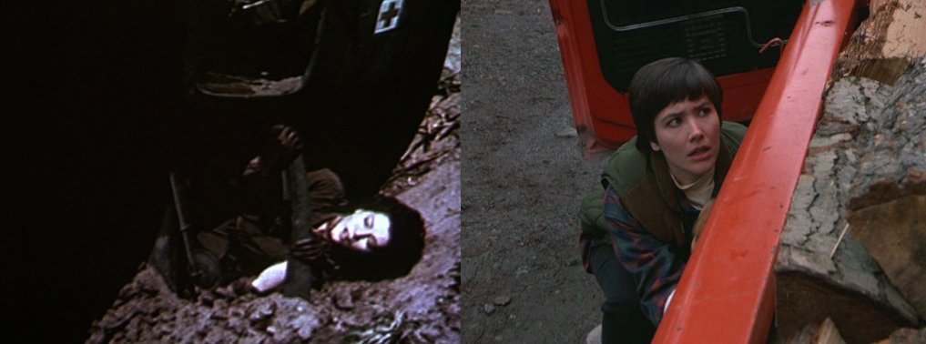 Then there is Maggie, who watches a war movie on television in which a woman is pinned by her truck. Curiously, her truck is stuck in the mud and her crouched posture recalls the movie scene. Of course, in the beginning Maggie sees her love life as a battlefield, but it is pretty interesting how when this similar scene plays out in real life her story is transformed from one of war to that of a fairy tale.