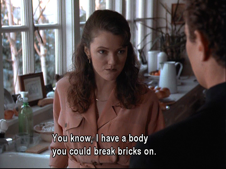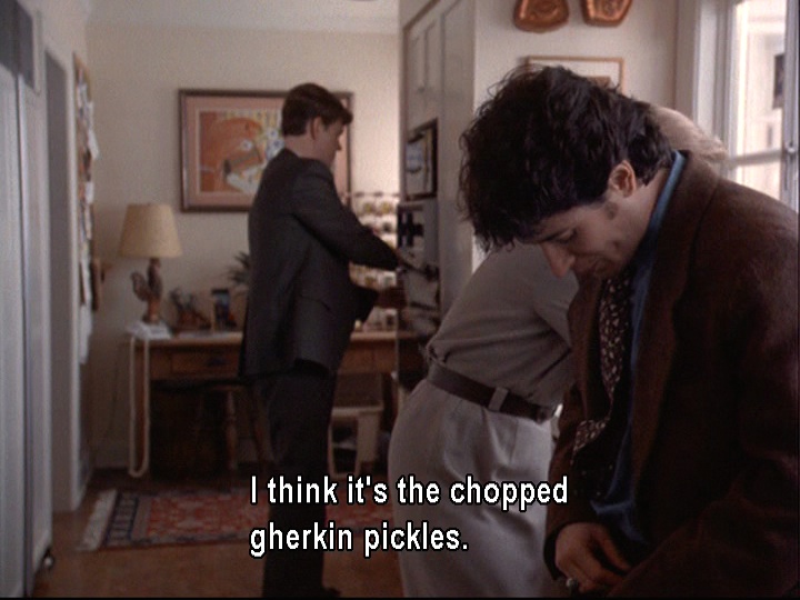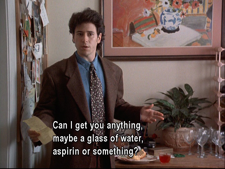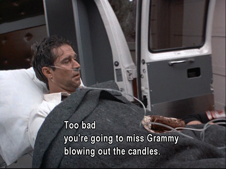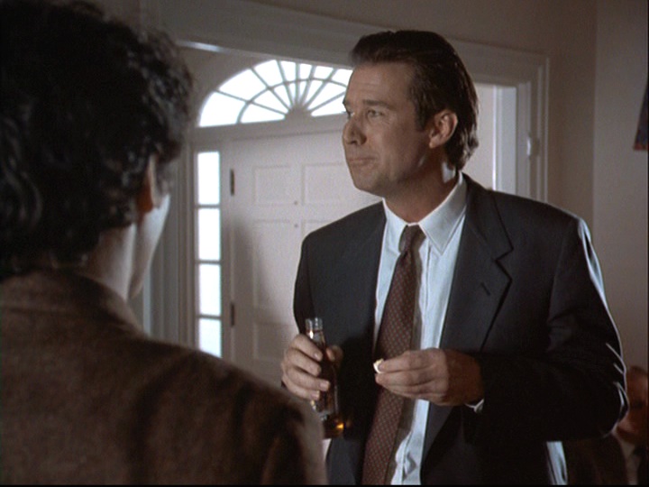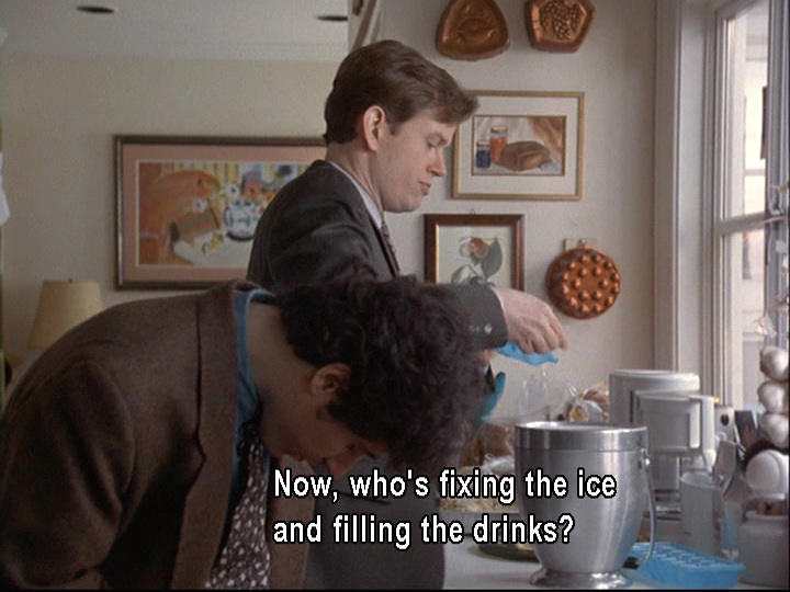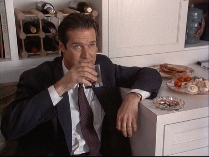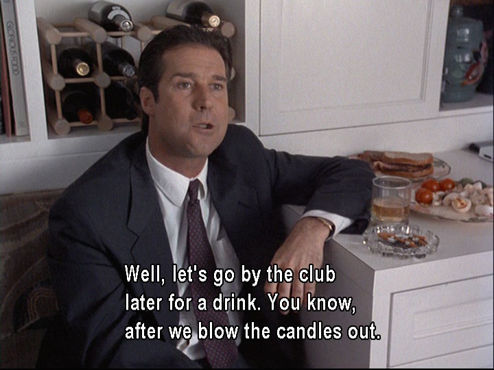 Earlier, the only beverage we had seen Joel consume was cranberry juice, which was spilled on him. His non-alcoholic beverage is in stark contrast to the beer and bourbon (or scotch?) that Jed (aka the Jedster) drinks in quick succession. As soon as he arrives, Jed also immediately grabs a couple of devilled eggs from Stephie’s tray. He seems to be a man with a voracious appetite, and not only for food. He is a stockbroker who oversees a not-too-small operation and has a yacht called the Fortune Five (possibly because he aspires to run a Fortune 500 company?). His consumption of food, alcohol, and cigarettes seems to reveal his physical and monetary gluttony. Even when he’s leaving in an ambulance, he’s given a piece of cake for the road.