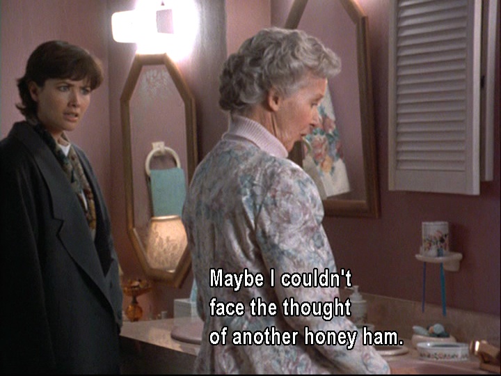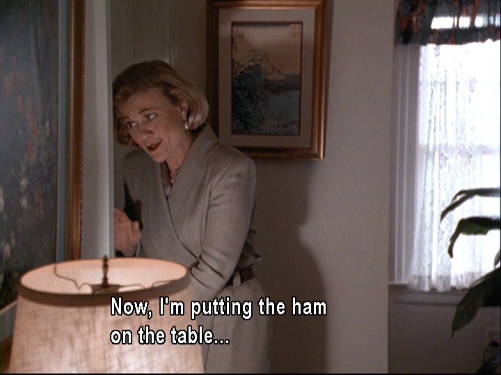 Shortly after this scene, her daughter Jane tries to bluff her that she needs to come down right away because the ham is going to be on the table soon. Clearly, she doesn’t know that the ham seems to be a symbol for Grammy of a routine she’s become tired of.