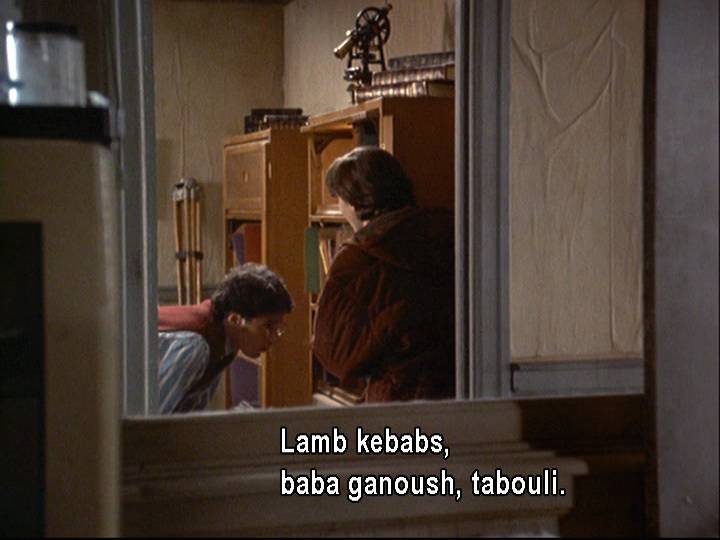 The episode begins with Maggie trying to convince Joel to come to Michigan to attend her grandmother’s eightieth birthday. Her opening gambit is an all-expenses paid trip. No dice. Then, she tries to sweeten the offer by mentioning food. (Interestingly, she implies that Joel is really into Middle Eastern cuisine.)