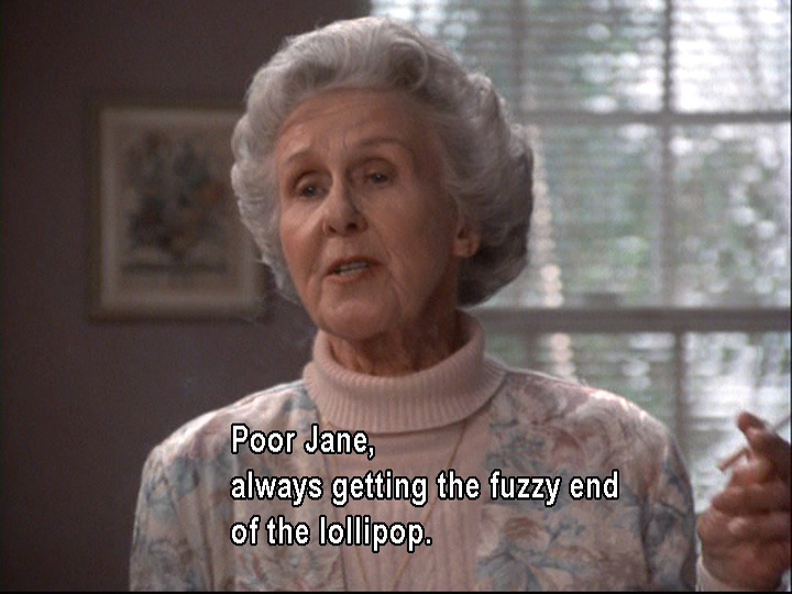 Grammy calls Jane’s bluff, comments that this is the way Jane has been acting her whole life, and uses candied imagery to describe her daughter’s attitude. Maggie explains to her that it’s what’s called “passive aggressive” behaviour nowadays.