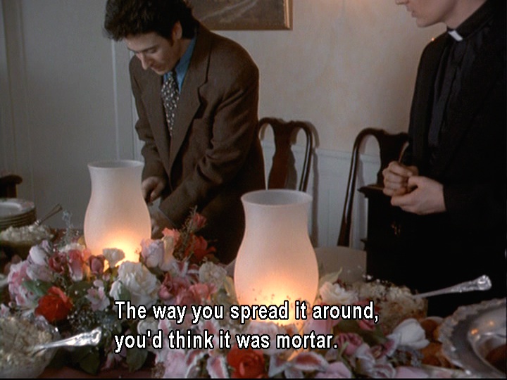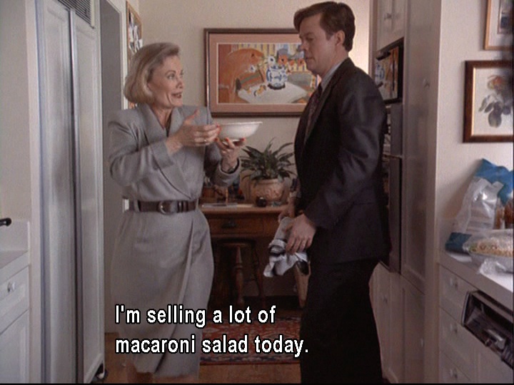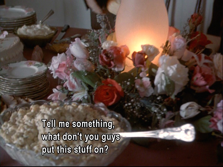 Joel comments to Reverend Harding that “you people” (we’re taking this to mean WASPs like the folks who live in Grosse Pointe) seem to put mayonnaise on everything. We’ll later have a call back to this comment when Jeffy says that the reason his mom’s macaroni salad is so popular is the mayo.