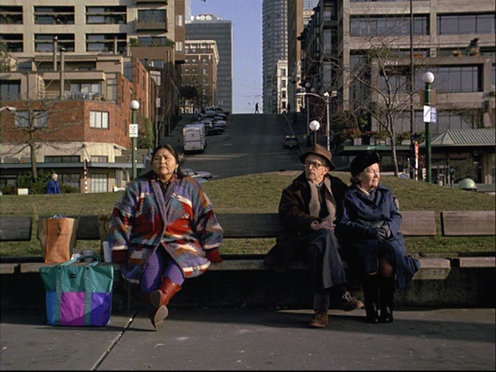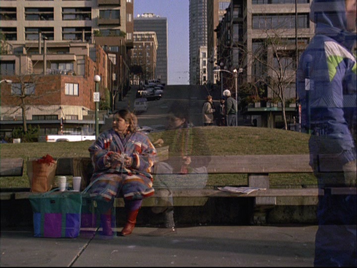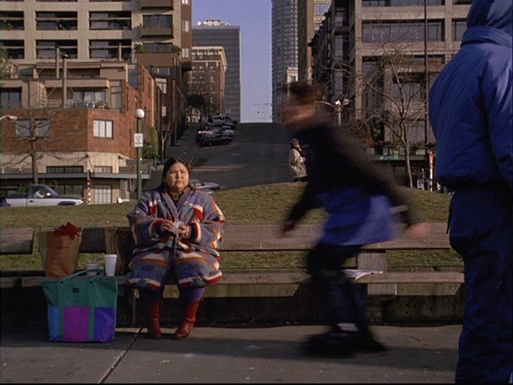 In our podcast discussion of “Learning Curve” (4.15), we talked a lot about how much we enjoyed Marilyn’s storyline in this episode. Her adventure is relayed almost entirely via visuals and music. (The song that plays over her adventure in Seattle montage — Georgia Wettlin-Larsen’s “Ojibway Square Dance“ — is especially well chosen and fitting.) Besides showing the landmarks of the city, we get to see several different shots of Marilyn sitting on a bench.