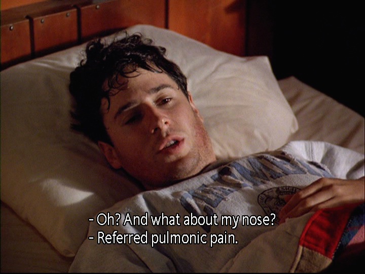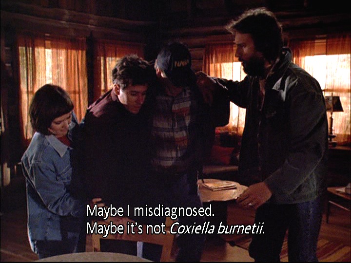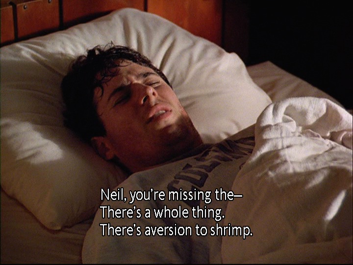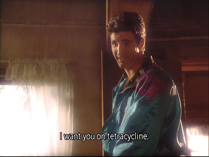 Eventually, Neil Weisberg diagnoses him as having Coxiella burnetii, which Joel is already certain he doesn’t have. When Joel disagrees with his diagnosis (in an hallucination), Dr. Neil Weisberg puts him in his place, asking “Who’s the infectious disease man here, you or me?” He really puts him in his place by deploying the medical jargon Joel uses on his patients to assert his superiority. And to add insult to injury, Dr. Neil even tells him to take the medication “QID”, just as Joel told his patient to take his medication near the start of the episode.