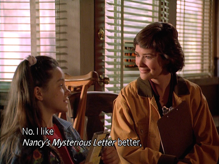 At Joel’s office later, she discusses Nancy Drew books with Marilyn and The Unfamiliar Girl With the Broken Leg.