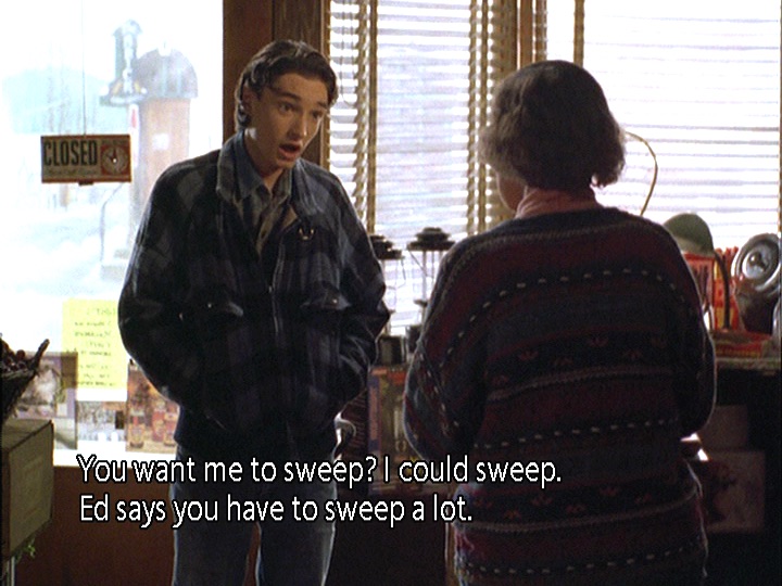 Ed is shown dusting when he spots Eugene in the street. Later, we see him sweeping. He’s even holding the broom when Ruth-Anne says to him that she needs to “come clean.” He also tries to convince Eugene that Ruth-Anne was likely washing Walt’s clothes when he saw them in the morning. We’ll also see Donny Spellman say the word “sweep” repeatedly when he confuses Ruth-Anne about taking over Ed’s job.